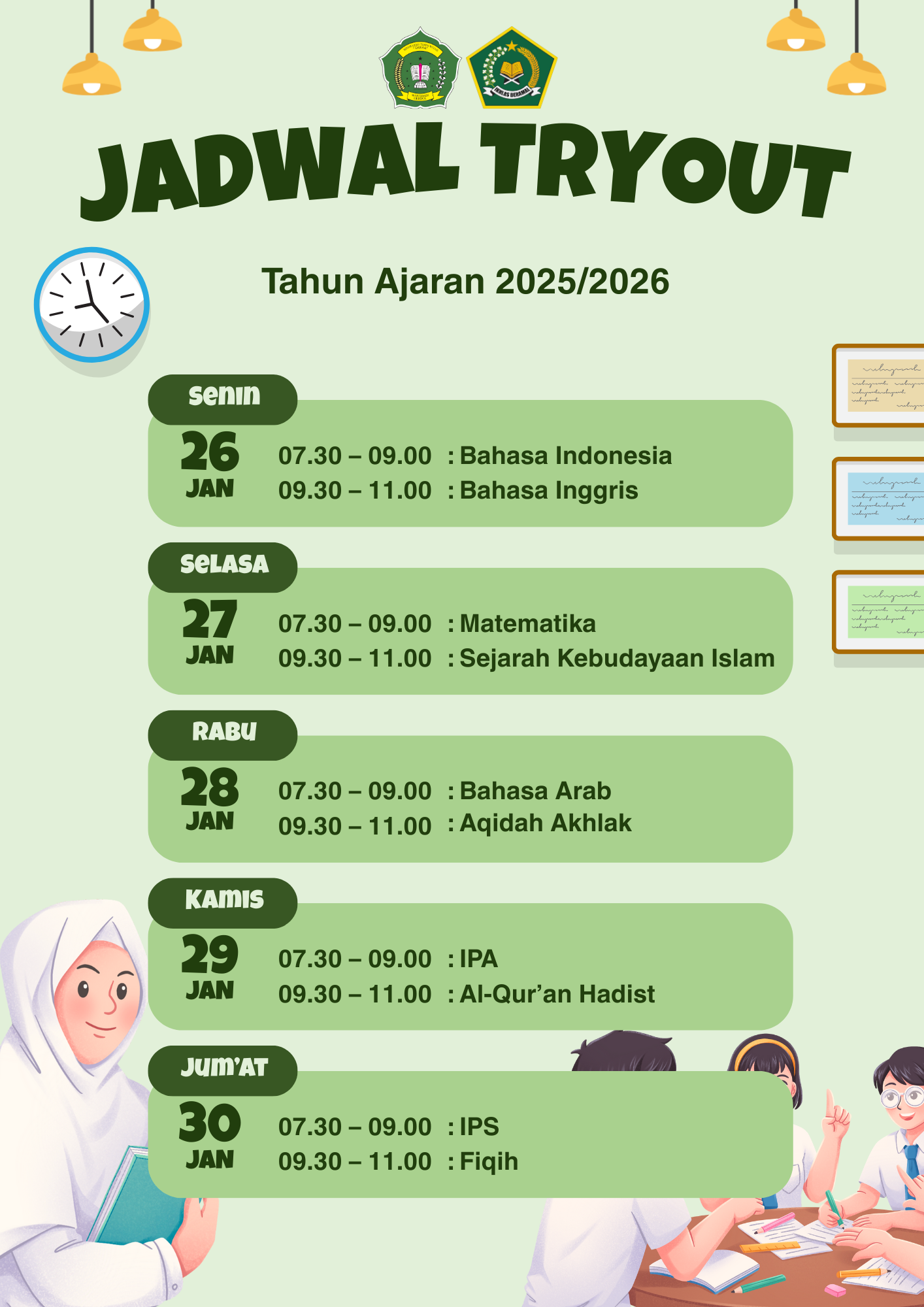 Kehadiran: Peserta wajib hadir di madrasah paling lambat 15 menit sebelum sesi dimulai.